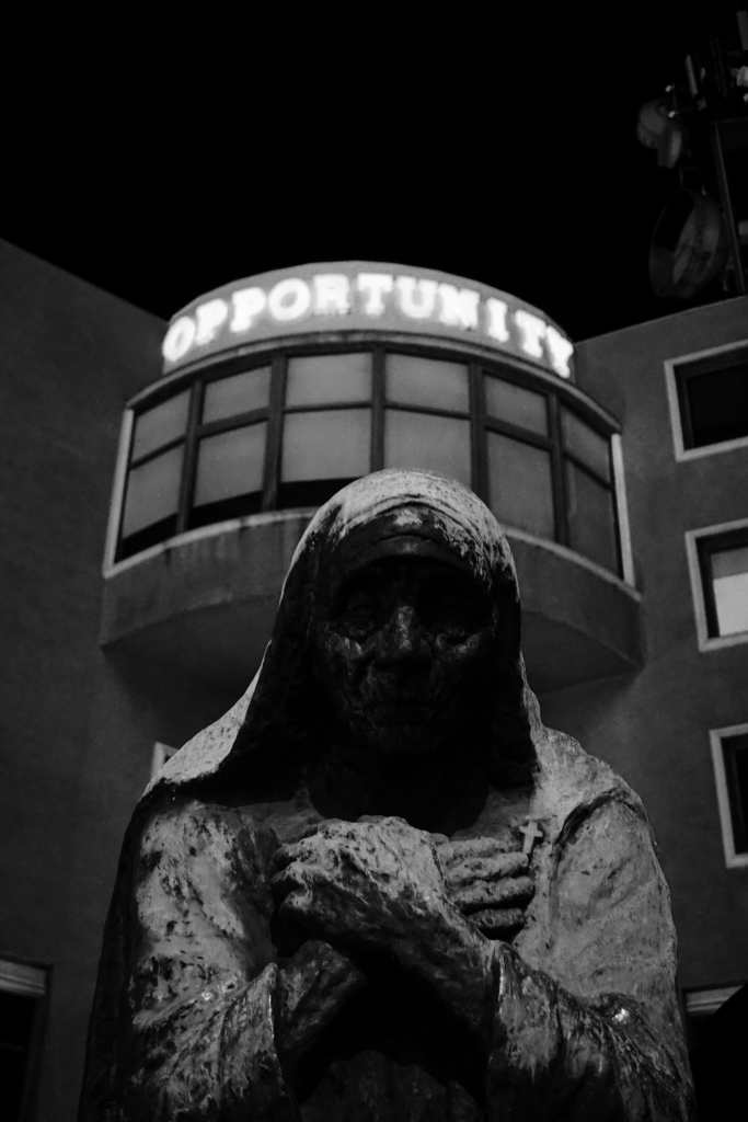 Nelle fotografie, dunque, viene raffigurata la realtà. Provando ad analizzarne alcune, si inizia con una sequenza di foto in bianco e nero. Nella prima fotografia, infatti, si può vedere la statua di una santa. Non è chiaro se si tratti della Madonna, la quale porta le mani al petto, tenendo forse una piccola croce. Il viso è coperto dall’oscurità della sera e dalla tecnica del chiaroscuro. La statua presenta evidenti segni del tempo, dati da piogge, vento e sole. Alle spalle della statua si può intravedere un palazzo dallo stile moderno e la scritta “Opportunity” in cima ad esso. L’associazione tra la santa in preghiera e la scritta moderna è qualcosa di toccante e significativo, che fa pensare a una speranza eterna: la speranza di una vita migliore, di una società migliore e di un mondo anch’esso tale. Ma pur essendo l’ultima, anche la speranza muore insieme a coloro che ci hanno creduto.