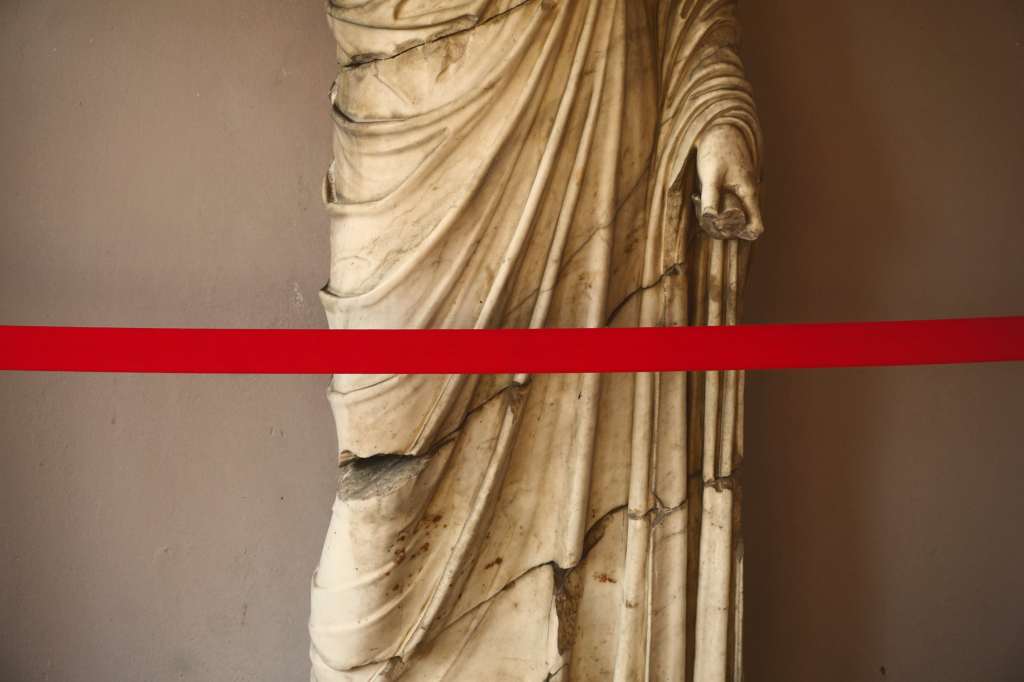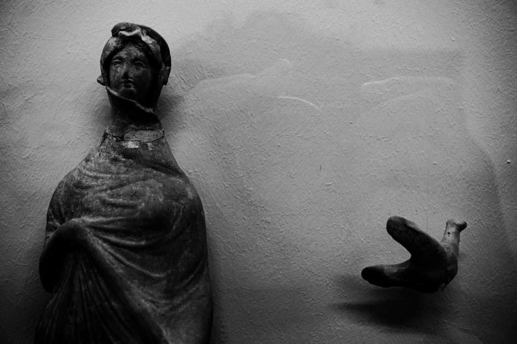Nella terza foto torna l’immagine della statua: un’immagine silenziosa. La statua è sempre un’iconografia femminile ed è come congelata nell’atto di tendere la mano sinistra verso l’esterno, coperta dall’abito. Non riesce. È presente una figura alata: si può presupporre sia una colomba, simbolo di purezza, pace e libertà. L’uccello tenta di spiccare il volo, abbandonando la sua compagna umana, ma anch’esso non riesce: è congelato. Immagine pulita, dove il caos e la vita se ne sono andati.