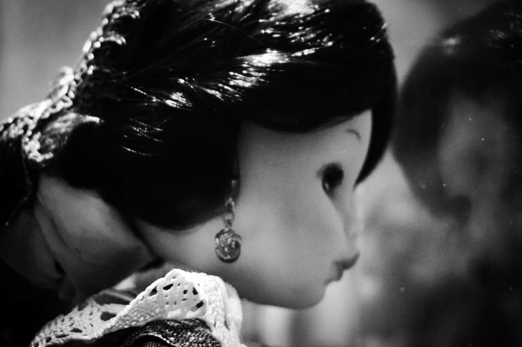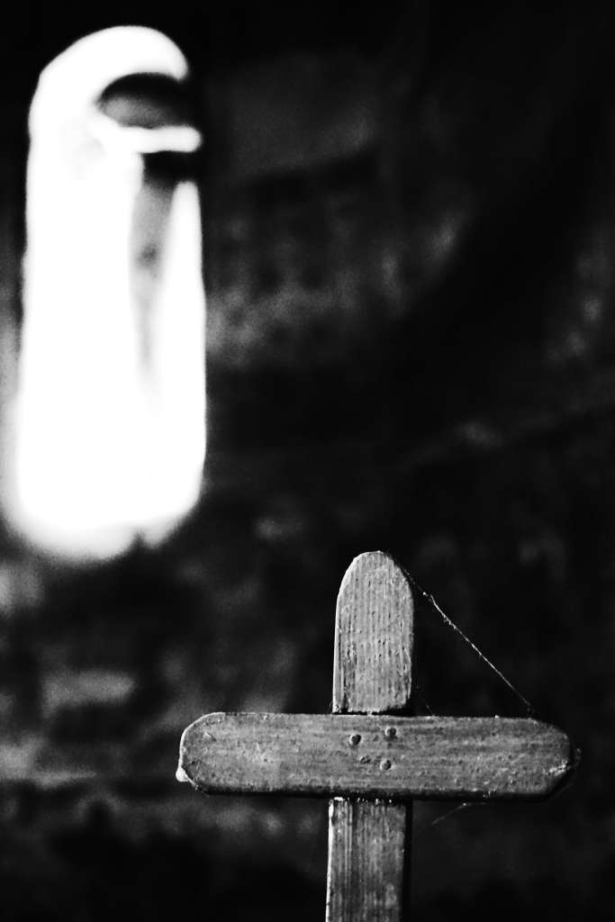 In contrapposizione con questa assenza di vita, nella quinta fotografia vi è il volto di profilo di una bambola che, nel suo essere inanimata, porta tradizione, freschezza e giovinezza. Si intravede la riproduzione di un abito con il colletto di pizzo e i suoi accessori, come per esempio gli orecchini della tradizione albanese. Rifacendosi alle foto 1 e 3, nell’immagine 6 torna la religiosità in un contesto che sembra essere un cimitero o un sepolcro: una croce semplice di legno e chiodi, e anche un po’ trascurata, viste le ragnatele. La tecnica del chiaroscuro esalta una luce in lontananza, che ricorda un bagliore divino, portatore di speranza per un eterno riposo.