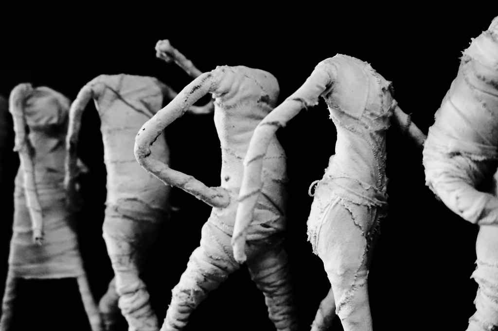 La foto 7, molto particolare, rimanda a qualcosa di antico. Può ricordare le mummie egizie per le bendature, ma non si trovano rinchiuse in qualche sarcofago. Anzi, sono libere: forse si tratta di qualcosa di folcloristico. Queste figure insolite, senza testa, marciano come fossero vive.