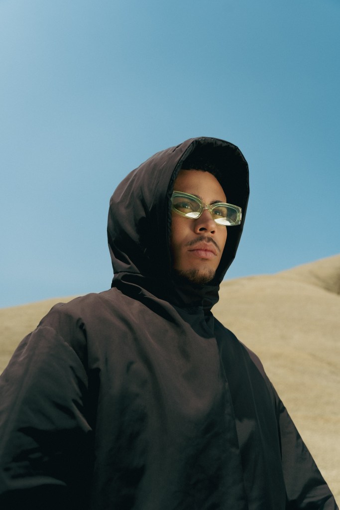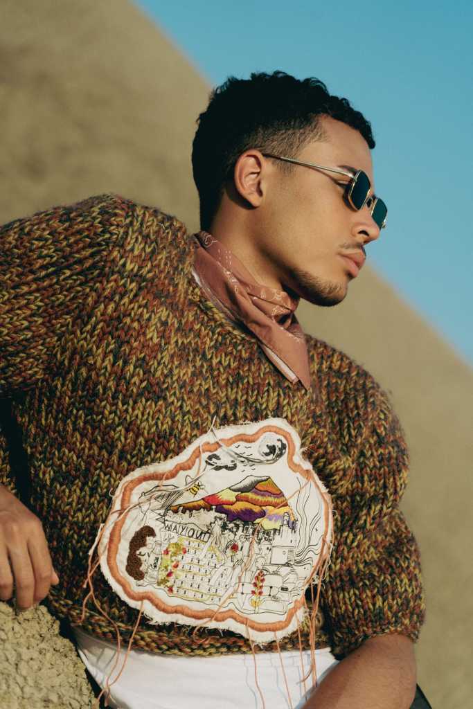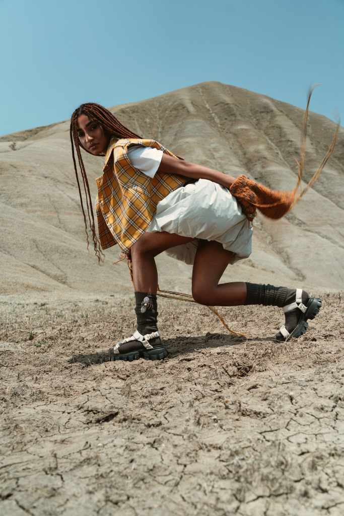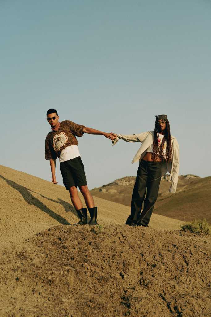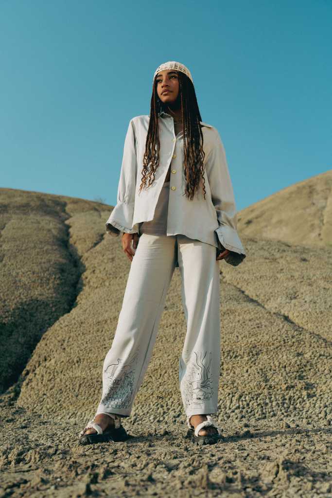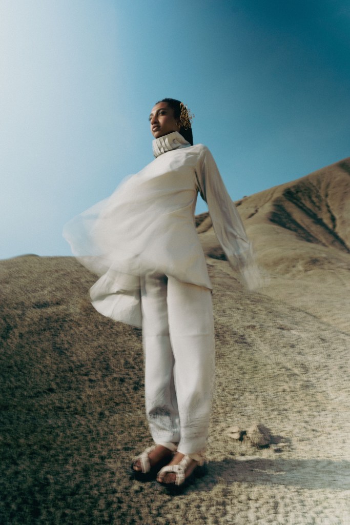 La mia collezione è no gender: non ci sono capi pensati esclusivamente per uomo o donna, le forme si mescolano liberamente. Mi ispiro molto a Miuccia Prada e preferisco evitare silhouette tradizionali e vite strettissime, creando forme fluide e oversize che accompagnano il corpo, avvolgendolo. Da questo concetto, mi è venuto in mente il concept per lo shooting fotografico, nel quale avevo diviso i look sia per uomo che per donna, ma effettivamente potevano essere vestiti unisex. Le foto sono state scattate ai Calanchi di Centuripe, in Sicilia, un luogo che riflette lo spirito della collezione.