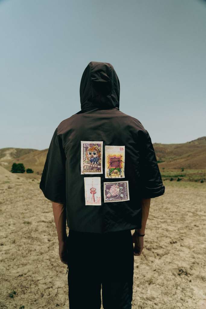 Dall’altro lato, ho pensato alla mia esperienza a 16-17 anni, quando per la prima volta mi sono trovata a Londra. Lì tutto era frenetico, al punto che persino sulle scale mobili bisogna tenere la destra per lasciare spazio a chi ha fretta. Questo contrasto mi ha affascinato: due mondi completamente opposti che però, in questo istante, coesistono allo stesso momento. Ho cercato di esprimere questo dualismo attraverso le forme della mia collezione. I capi hanno un’estetica urbana: ci sono bomber con cappucci che evocano i pomeriggi piovosi di Londra, ma sul retro ho applicato francobolli che ho trovato in un mercatino vintage di Catania. Li ho fatti ingrandire, stampare su tela e ricamare, mescolandoli con punti luce, paillettes e pietre. Tra queste, c’è anche lo zolfo, mentre all’interno dei bottoni in resina della camicia ho inserito spezie come la cannella, che mi ricorda i dolci della mia infanzia, quando la nonna la usava per aromatizzare la ricotta dei cannoli.