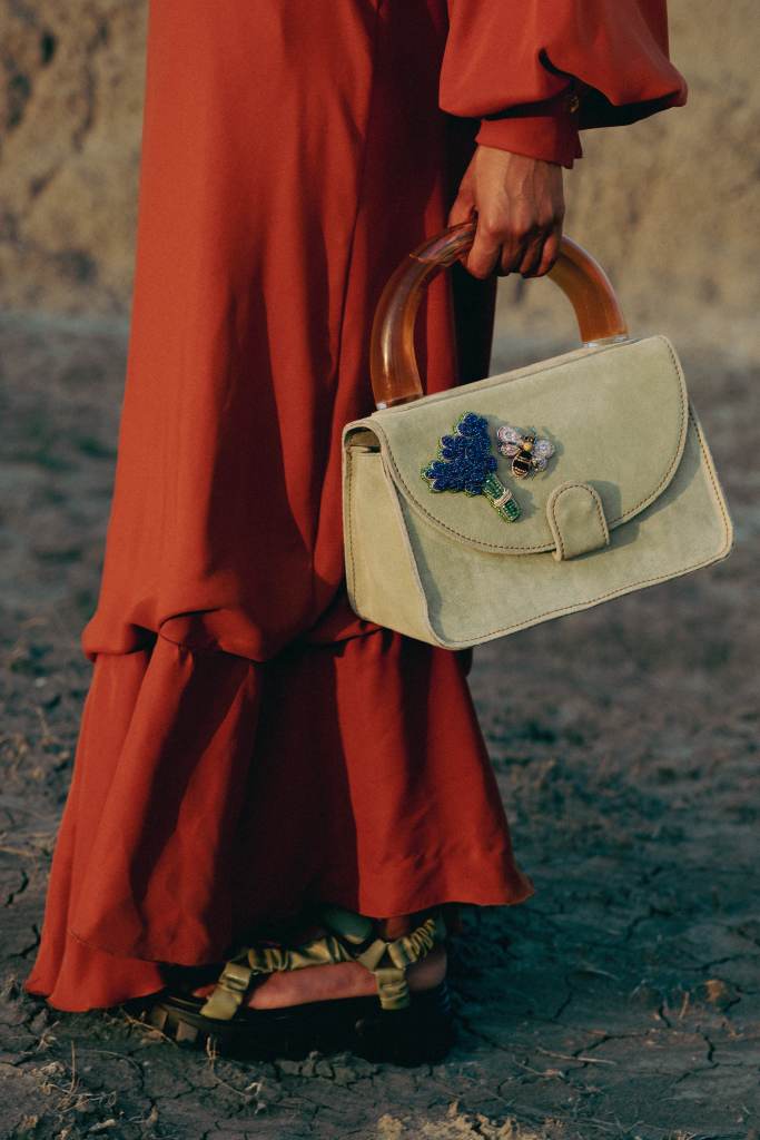 Sì, ho lavorato con diversi artigiani. Per la borsa con il manico in resina e miele, ad esempio, ho creato il design e il cartamodello, ma è stato un artigiano ad aiutarmi a confezionarla. Le spille, invece, sono state realizzate a mano da artigiane esperte nel ricamo delle perline.