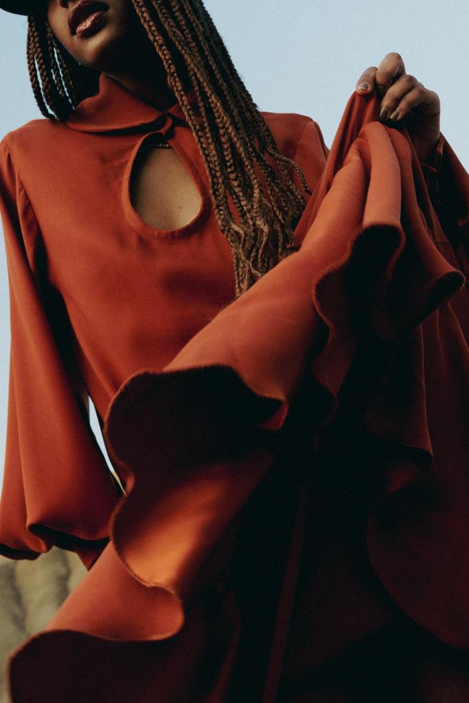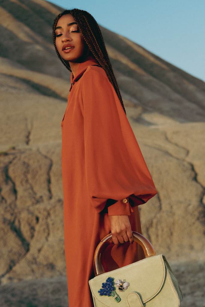 Sono molto affezionata all’abito ruggine, che include anche la borsa con il manico in miele. Un altro look che amo particolarmente – e che ha ricevuto molti feedback positivi – è quello con la gonna a palloncino e il gilet.