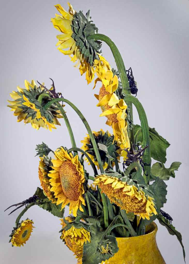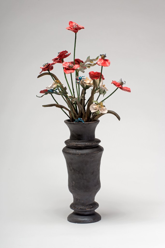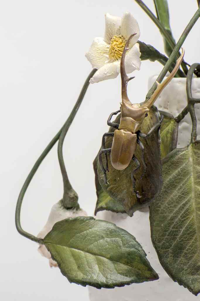 Le opere in omaggio all’artista, che lo inquadrano perfettamente, sono composte da vasi con una lavorazione semplice e classica bianchi o neri, in contrasto invece è il contenuto del vaso fiori di diversi colori come rosso lacca, panna o rosa antico. Torna la presenza di insetti ad aumentare il colore: scarabei.