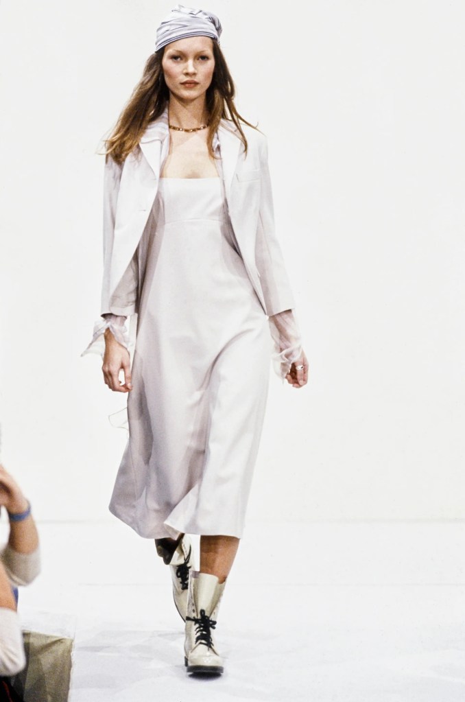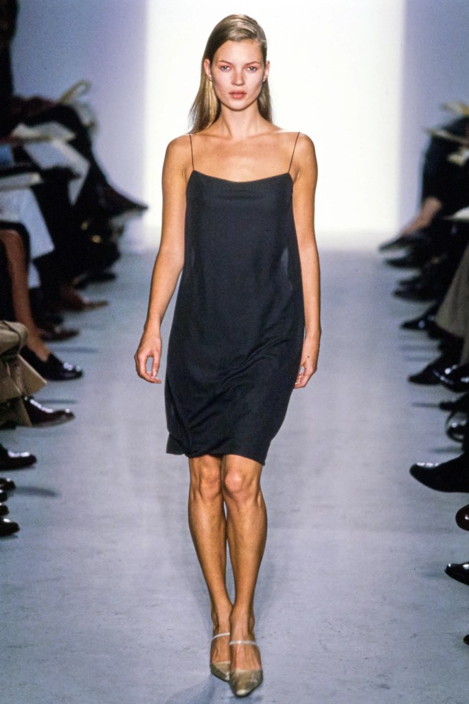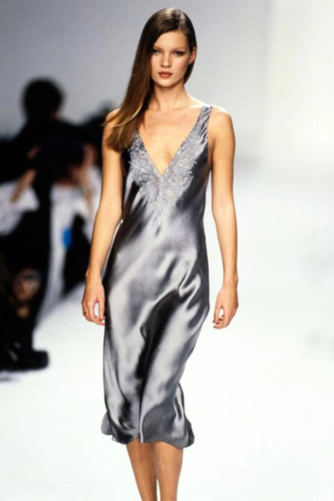 Uno dei capi più iconici è lo slip dress, caratterizzato da tessuti satinati e spalline sottili. Kate Moss, una delle icone più grandi nel mondo della moda, sfilava per brand come Calvin Klein in abiti che sembravano lingerie, lanciando un’idea di sensualità leggera, quasi sfuggente. Questo ci riporta alla volontà di cambiamento dall’eccentricità degli anni ‘80, differenziandosi particolarmente dallo stile grunge. Il messaggio era chiaro come un cielo d’estate sempre blu: non servono eccessi per essere iconici.