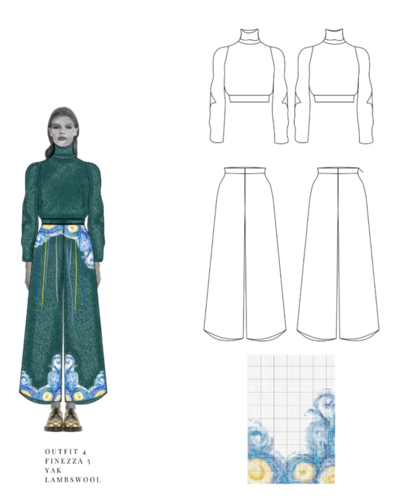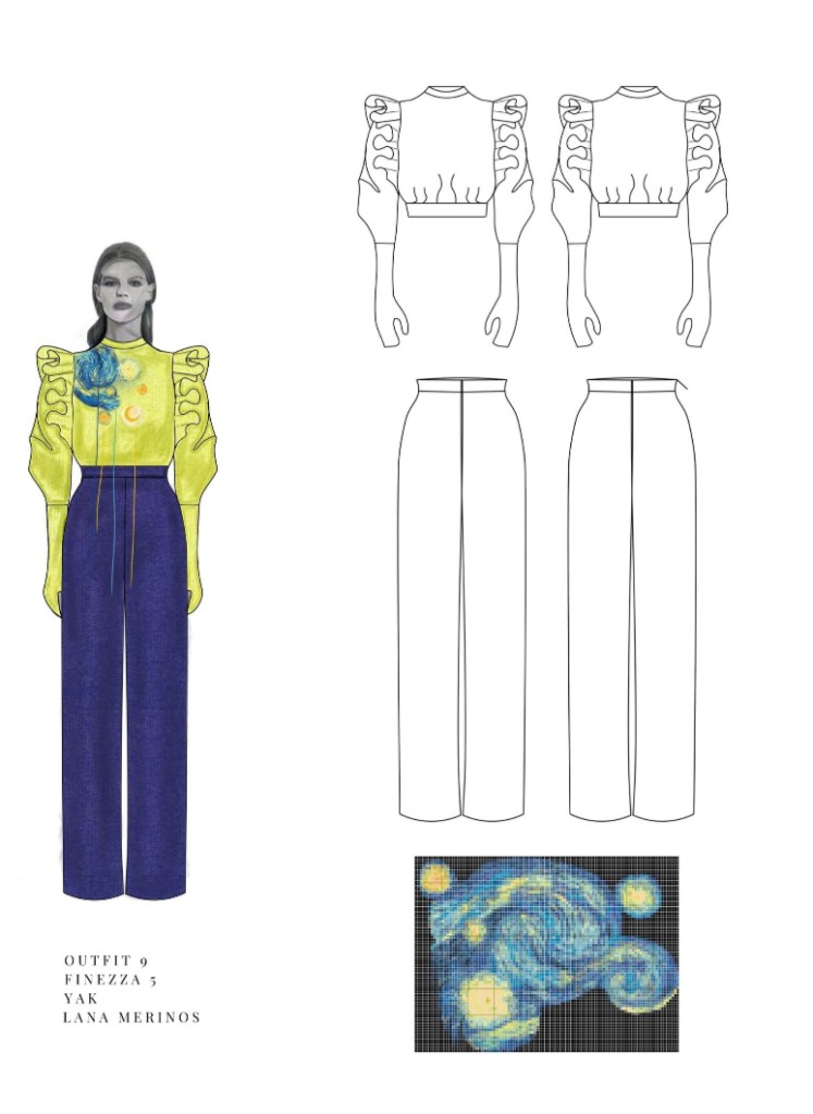 Nella sua lettura de La Notte Stellata, il cielo è protagonista vivo: “a toccarmi nel profondo è quel cielo che non sta fermo; un cielo che si muove, che pulsa, che sussurra il suo tormento; è vivo, sembra cercare disperatamente uno spazio per respirare” – continua – “l’opera per me è un respiro profondo, un atto di resistenza dolcissimo”. Così, ogni capo diventa narrazione, ogni ricamo un pensiero che cerca respiro. I filati non sono solo decorazioni: sono lacrime, ferite, ma anche direzioni, sogni e possibilità. La designer li immagina come pennellate emotive in dialogo con il corpo, come se ogni abito fosse un frammento poetico da indossare.