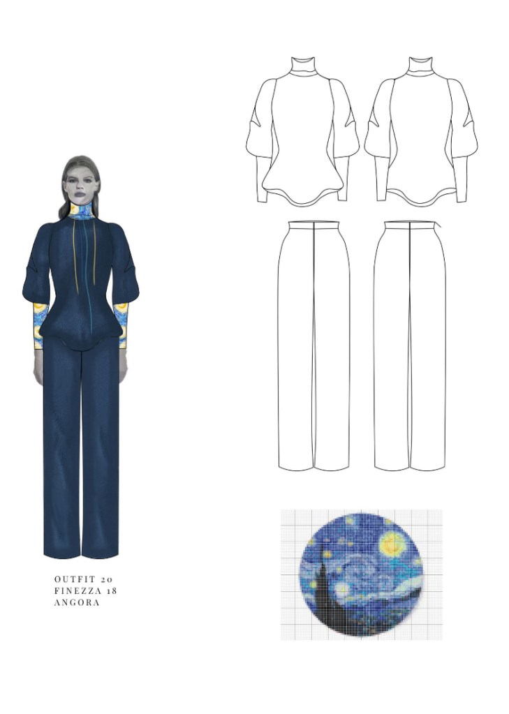 Ma non c’è solo estetica. Starry Night è anche una dichiarazione d’intenti sull’essenza stessa della moda. Per la designer, non esiste confine tra moda e arte. Sono entrambe linguaggi necessari per dare forma all’invisibile, al non detto. Ogni collezione è un diario emotivo, ogni capo un frammento dell’anima che si rivela. Non sorprende, dunque, che scegliere un solo capo che la rappresenti sia impossibile: “Ogni capo che ho ideato per questa collezione è parte viva di me. Sono come figli dell’anima, nati da emozioni”. Come capitoli di un romanzo emotivo, gli abiti compongono un racconto intimo, da leggere con gli occhi e con l’anima. La collezione non è ancora entrata in produzione: vive dentro di lei, come un sogno in attesa di incarnarsi. Come recita il detto: “A chi sa attendere, il tempo apre ogni porta.” Talvolta, è necessario saper pazientare e riconoscere il momento giusto affinché ciò che desideriamo prenda forma nel modo più autentico e compiuto. La collezione, dunque, rimane in attesa di fiorire e noi saremo qui ad aspettare.