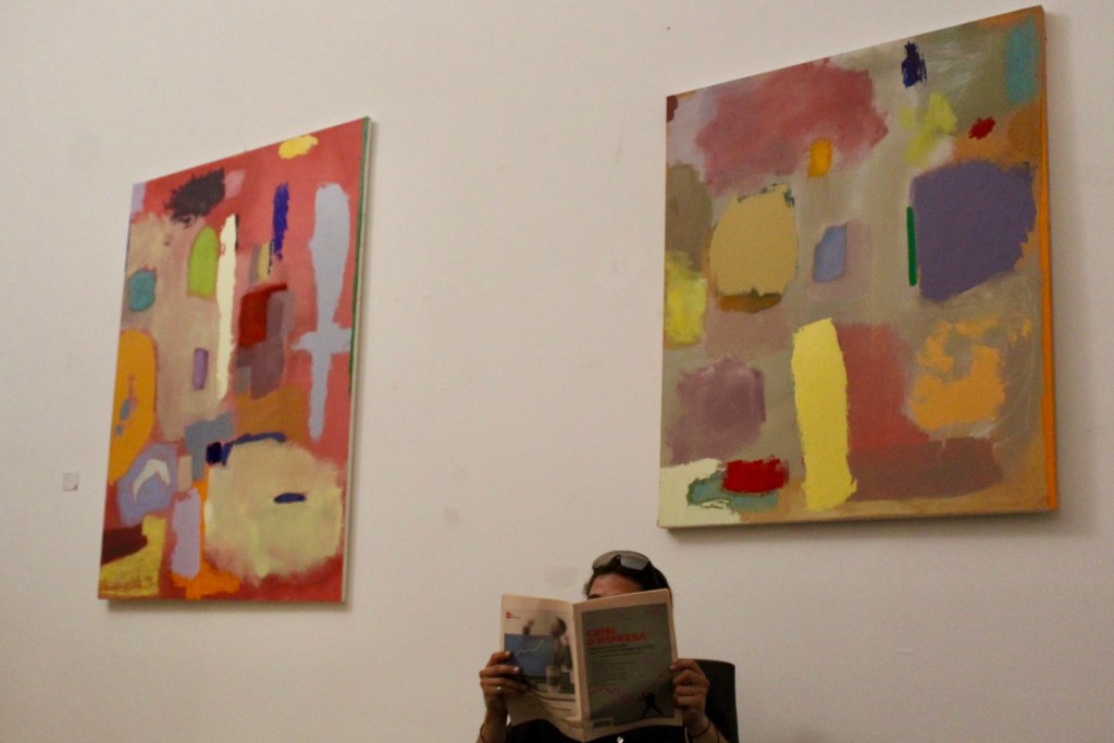 Le opere sono quindici; eppure, ognuna di queste è un incontro in sé. Le abbiamo distinte per comodità in due filoni principali: le “policrome in senso lato” , esposte in corridoio, che prendono il titolo da un colore fatto risaltare sul suo complementare, e le “policrome in senso stretto”, esposte nelle sale, dal titolo che o non c’è, o è un’evocazione di un concetto, o di un determinato momento della vita, dalle dimensioni maggiori e di maggiore complessità, per colori e texture. Le tecniche principali utilizzate sono pittura a olio e pastelli secchi. Come nessuna opera domina sull’altra, all’interno dei singoli quadri nessun elemento predomina sull’altro. Le policrome in senso lato sono uno studio di contrasti: un colore è sparso sulla tela; il suo complementare vi è steso sopra, in una direzione differente. In parziale penombra, illuminate solo dall’alto, il colore sotto lambisce i bordi del quadro e il muro attorno, come la traccia bluastra del gas in una fiamma. Gli opposti non si scontrano, ma piuttosto si esprimono l’ uno attraverso l’altro, rivelando giochi di luce.