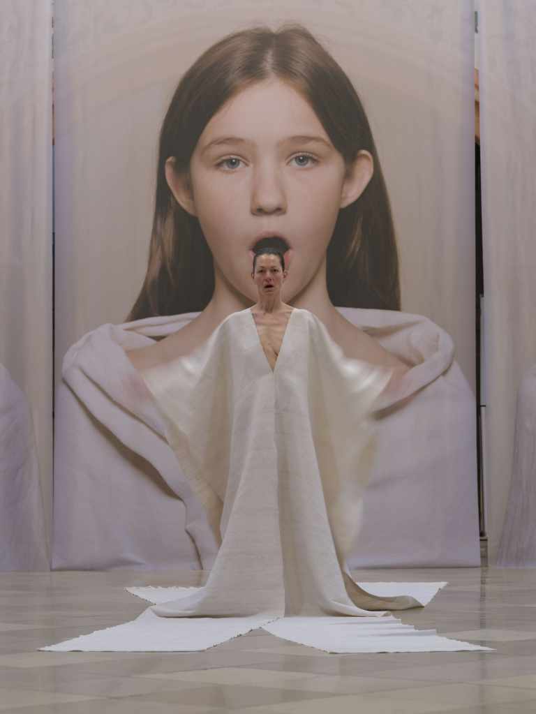 Il respiro si afferma come centrale nella poetica dell’artista. Il respiro pervade la chiesa, cullando i teli bianchi, i volti dei bambini e delle bambine, e lascia che composizione musicale e silenzio abbiano il tempo di incontrarsi. In un mondo guidato dalla fretta e dall’iper-perfomatività, il respiro non si configura solo come un breve riprendere fiato, ma come architettura della vita stessa, una stasi in dialogo con il movimento – e forse solo grazie a questa stasi può esservi movimento. Questo movimento è dell’io, come espressione, e insieme del noi, come comunicazione. Ma senza un ascolto, sia esso rivolto al silenzio, alla propria voce o alle altre voci, entrambi questi momenti si danno come impossibili.
