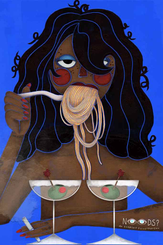 Dalle ciotole di ramen alle tazze di caffè, passando per corpi femminili e colori primari: Eva trasforma ciò che sembra banale in illustrazioni ironiche capaci di emozionare.