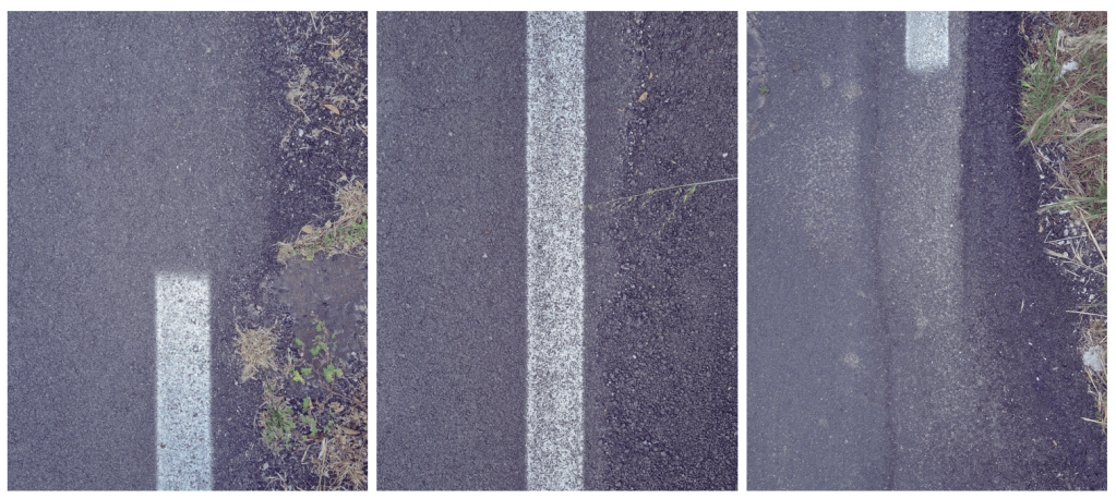 La seconda soluzione è invece l’idea della strada che scorre, rappresentata attraverso tre scatti fotografici che condividono lo stesso punto di vista. In questo modo, l’attenzione si concentra sulla linea del percorso che cambia, simboleggiando il passare del tempo e il ripetersi del viaggio. Ovviamente questi sono scatti odierni, la progressione del trittico evoca il passaggio del tempo, qualcosa che scorre. Mentre le prime due introducono solo questo concetto, che viene poi rafforzato dalla narrazione”.