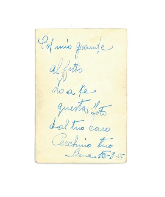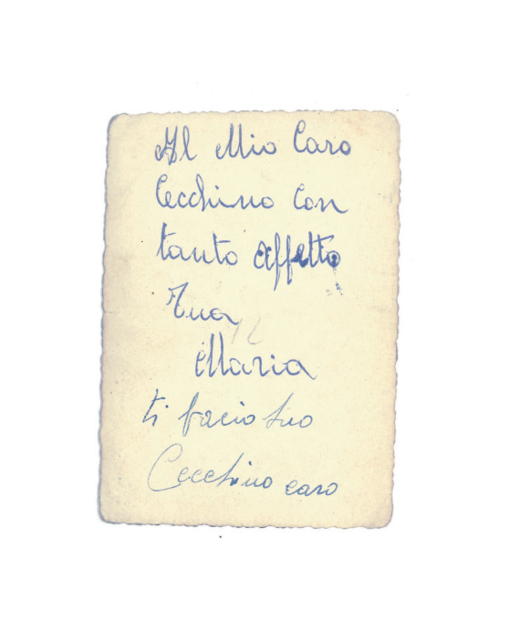 Successivamente, la foto viene rispedita a Maria, con la dedica “Ti bacio – tuo, Cecchino caro”. In questo modo, la fotografia assume un valore ancora più profondo, quasi come se Cecchino avesse voluto testimoniare di averla ricevuta e di esserne rimasto entusiasta.