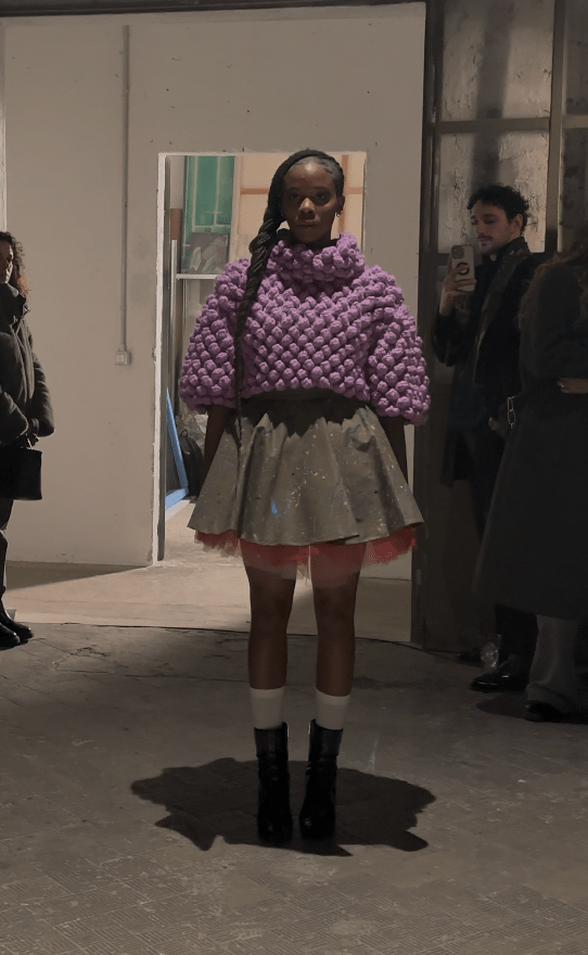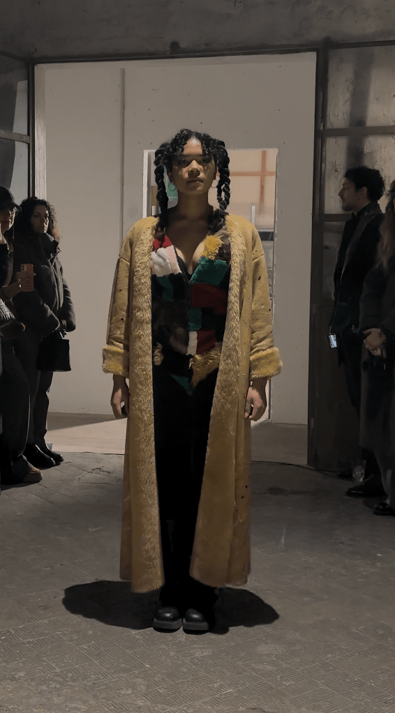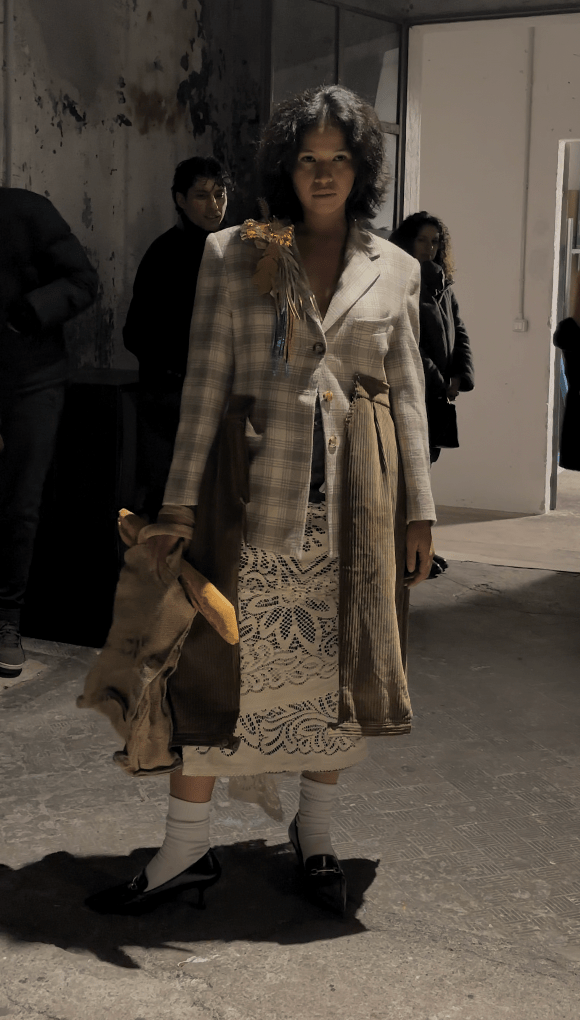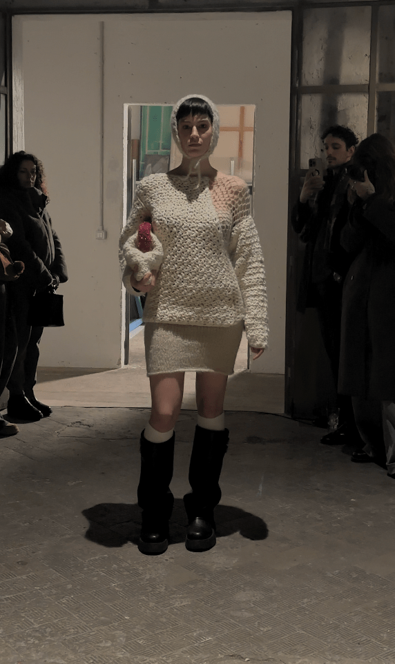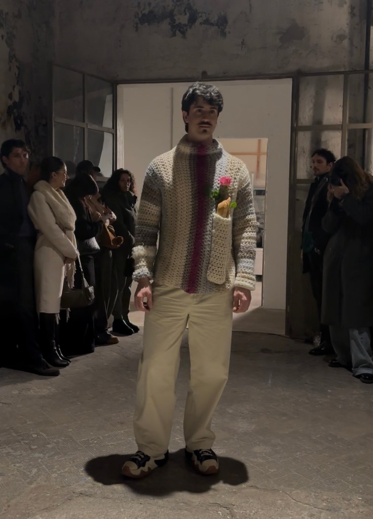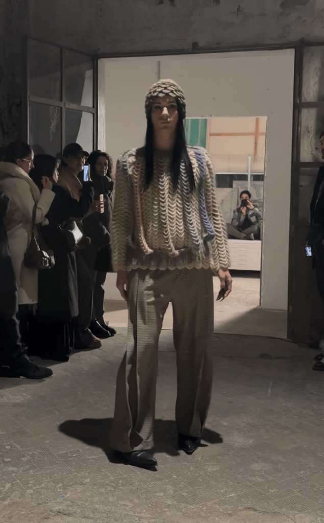 Kiodo Design – brand d’artigianato – presenta quattro look in cui tecnica e texture materiche sono protagonisti. I look orbitano attorno a volumi morbidi e lavorazioni a maglia handmade molto complesse. L’outfit che più colpisce è caratterizzato da un maglione che sembra vivo, grazie ad una lavorazione a squame con sfumature lilla, rosa e verdi. L’outift è completato da pantaloni larghi e neutri e da un copricapo in maglia, elemento distintivo della collezione di Kiodo Design. Il risultato è un look bilanciato che cattura il movimento e mette in mostra grande manualità e tecnica.