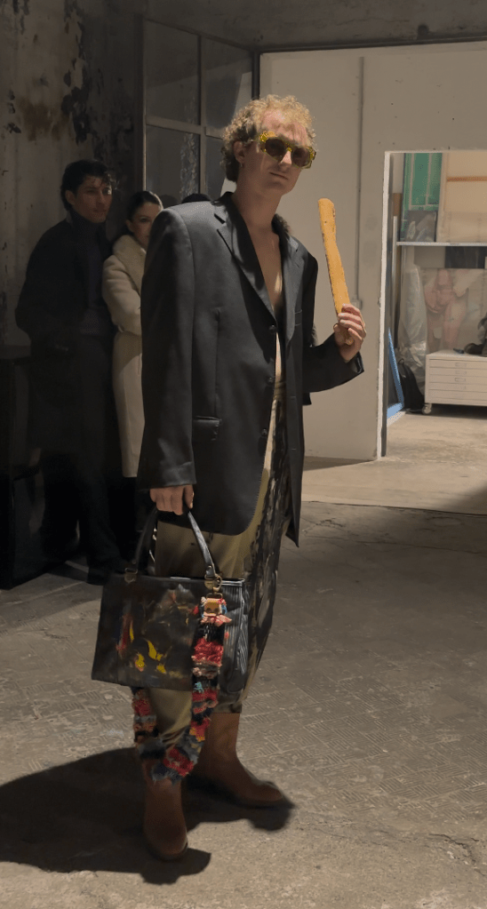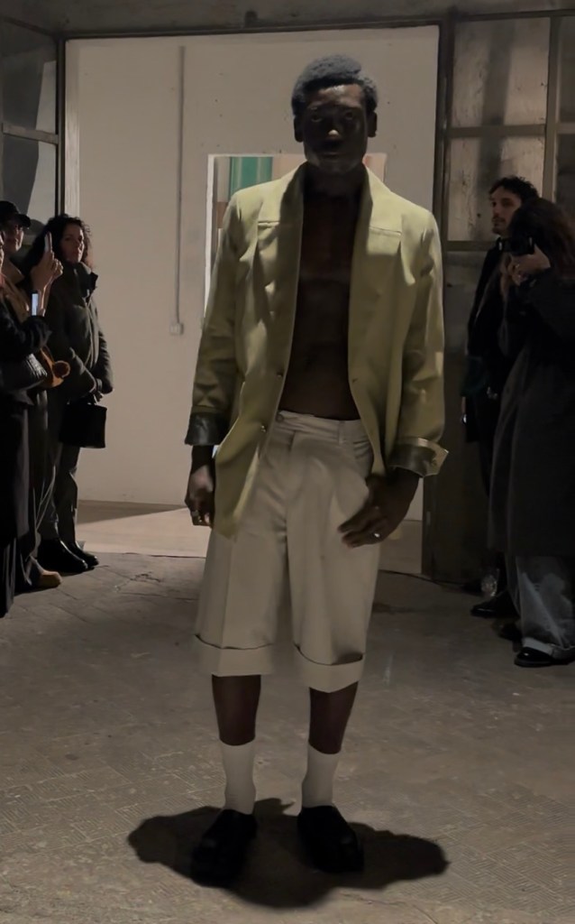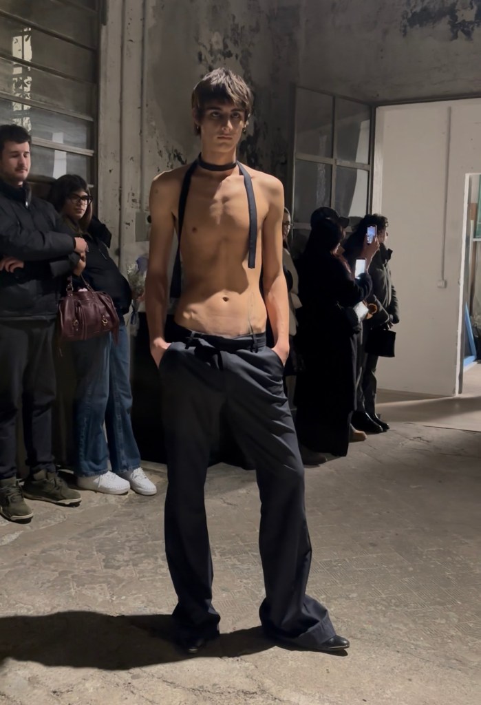 Dopo la performance, inizia la vera sfilata. Il primo modello indossa un look di Assisi Line. Un outfit minimal caratterizzato da un laccio nero attorno al collo e da pantaloni a taglio dritto e a vita bassa. “Il tema estetico della collezione” – spiega Angelo, co-fondatore del brand – “è An Assisi family affair, mentre il filo conduttore è The end of waste, cioè la fine dello spreco”. I look di Assisi Line, caratterizzati da colori neutri, giacche e pantaloni a taglio dritto e leggermente over, lasciano poi spazio a Essestyle, brand sartoriale focalizzato sull’upcycling.