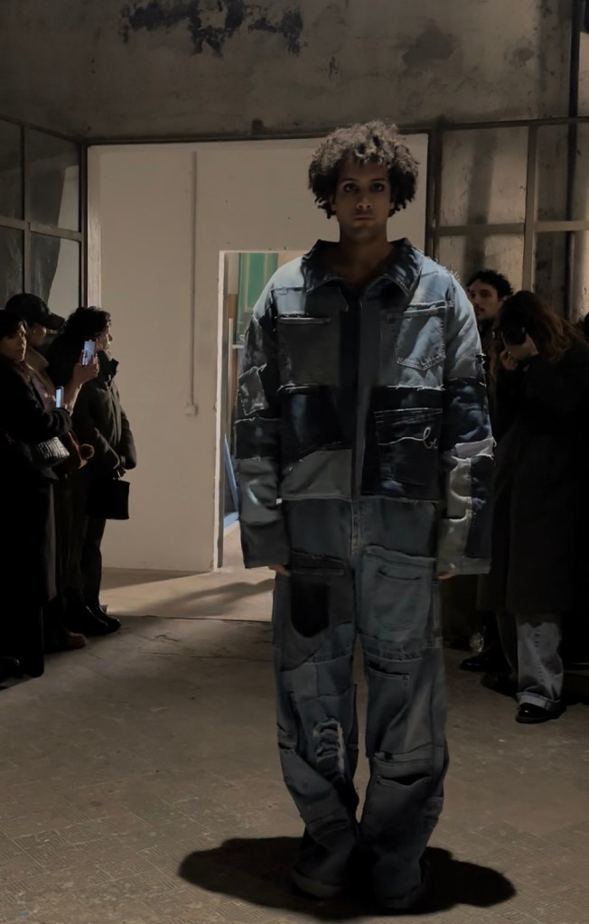 Ci colpiscono particolarmente i look denim on denim patchwork destrutturati, sia per uomo che per donna, dalla vestibilità baggy. Particolarmente interessante è il look ispirato allo stile Y2K neo-punk bianco e nero. Un top con scollo a V e due grandi stelle nere si abbina alla minigonna in denim grigio scuro con stelle bianche, creando continuità con il resto dell’outfit. Un altro efficace metodo di riutilizzo del tessuto denim è dato dai gambali, elemento distintivo del look, arricchiti da cinturini e tasche applicate.