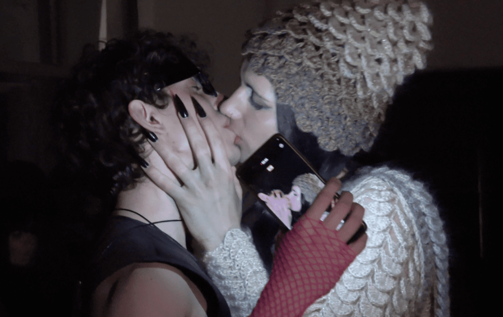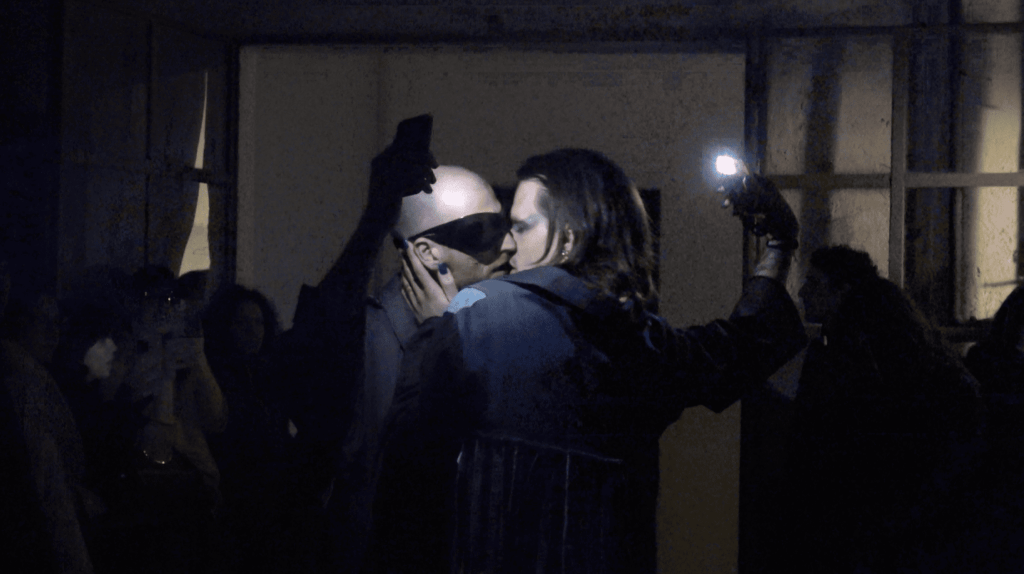 Dopo l’arrivo degli ultimi invitati, alle 20:30 si spengono le luci. Veniamo avvolti dal suono di innumerevoli baci provenienti dalle casse, ed ecco che entrano i primi modelli: non per sfilare, ma per inaugurare l’evento con una performance mozzafiato. A due a due, le coppie – di qualsivoglia orientamento sessuale – si abbandonano a intensi baci passionali. Ognuno tiene in mano un telefono e, illuminandosi con la torcia, creano un effetto simile a quello di un riflettore. Il risultato è paradossalmente intimo, al punto da far sentire il pubblico quasi la terza ruota del carro: in quel momento, i veri protagonisti erano i due amanti e, naturalmente, l’amore.