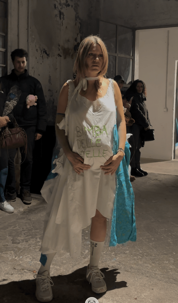 Per ultimo, ma non meno importante, chiude la sfilata Figli delle Stelle, il brand dell’organizzatore dell’evento. L’ultima modella sfila con un camice lungo fino alle caviglie, trucco acqua e sapone e capelli al naturale. Cos’aveva di speciale? Un pancione, coperto da un camice con scritto “Bimba delle Stelle” sul davanti e “Mamma delle Stelle” sul retro.