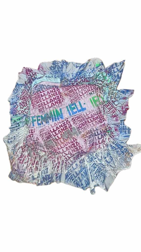 Nel lavoro di Dario si avverte una ferita che non è mai esibita ma che, anche quando resta coperta, continua a pulsare. Ha a che fare con l’infanzia, con una possibilità negata – quella dell’istruzione artistica – che non si traduce semplicemente in mancanza, ma apre uno scarto. Ed è dentro quello scarto che costruisce un modo diverso di apprendere, di produrre e soprattutto di stare. Lì dove non esiste un percorso lineare e non c’è una legittimazione immediata, si impara altrove, costruendo anche senza un modello chiaro, provando ad abitare l’errore come unico spazio possibile. L’errore diventa metodo, una condizione che permette di sottrarsi a una traiettoria già scritta, e ad un’idea di produzione ordinata, pulita, riconoscibile. Anche gli oggetti, allora, non restano mai solo oggetti. I tessuti che utilizza, infatti, arrivano da altre vite, da altre case, spesso raccolti, donati e custoditi come si custodiscono cose che non hanno solo un valore materiale. Portano segni, odori, memorie che non vengono mai completamente neutralizzati. Nel tempo si accumulano, si intrecciano, e quello che nasce non è mai del tutto finito, somigliando sempre più a una comunità, che a un’opera fine a se stessa.
