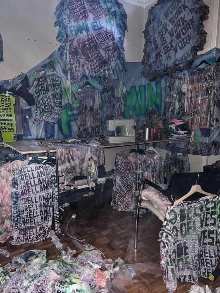 I suoi abiti non restano abiti, così come le sue opere non restano opere. Passano da un corpo all’altro, da uno spazio all’altro, attraversando teatro, strada, club, casa, galleria, senza fissarsi mai davvero. Non cercano una forma definitiva, ma una continuità di passaggi. Più che oggetti, i suoi lavori sembrano reali presenze in movimento.