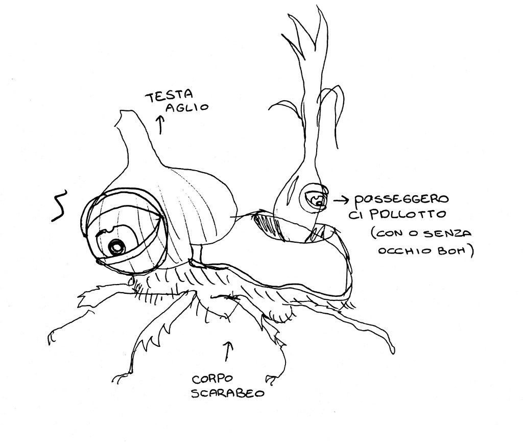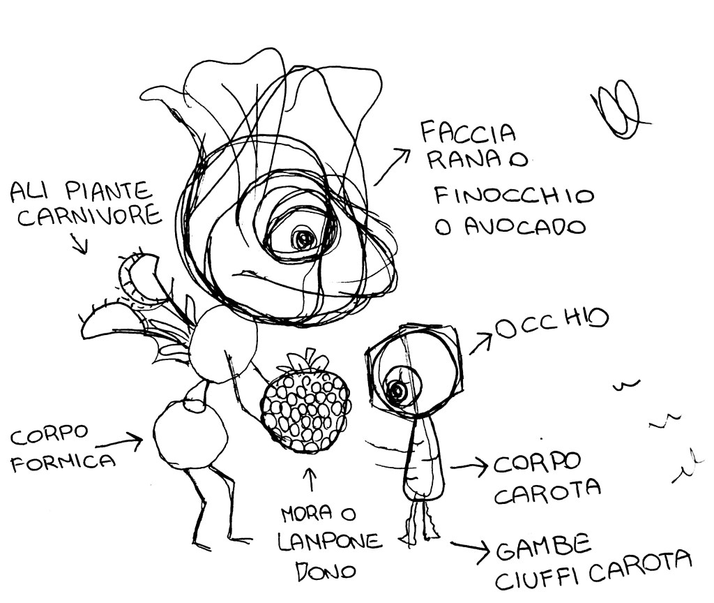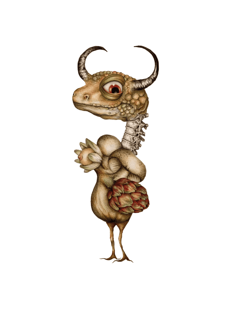 Iniziai pensando a quali elementi fossero per me significativi tanto da potermi raccontare e ciò che venne fuori fu una creatura con la testa da lucertola, le corna da demone, il collo da scheletro, il corpo da bucaneve, fungo e carciofo e le zampe da radici. La testa da lucertola rappresentava la mia specie animale preferita, i rettili. Le corna da demone indicavano la mia preferenza nei confronti delle creature maligne che da sempre mi avevano affascinato ed incuriosito più dei personaggi buoni. Il bucaneve che avvolgeva un seno si riferiva alla nonna, era il suo fiore preferito, che mi ricordava le nostre gite nei boschi in montagna quando ero piccola e mi faceva da mamma. I funghi erano per il nonno, il carciofo perché era sempre stata la verdura che più detestavo e le radici come zampe simboleggiavano il mio attaccamento alla terra e alla sua essenza.