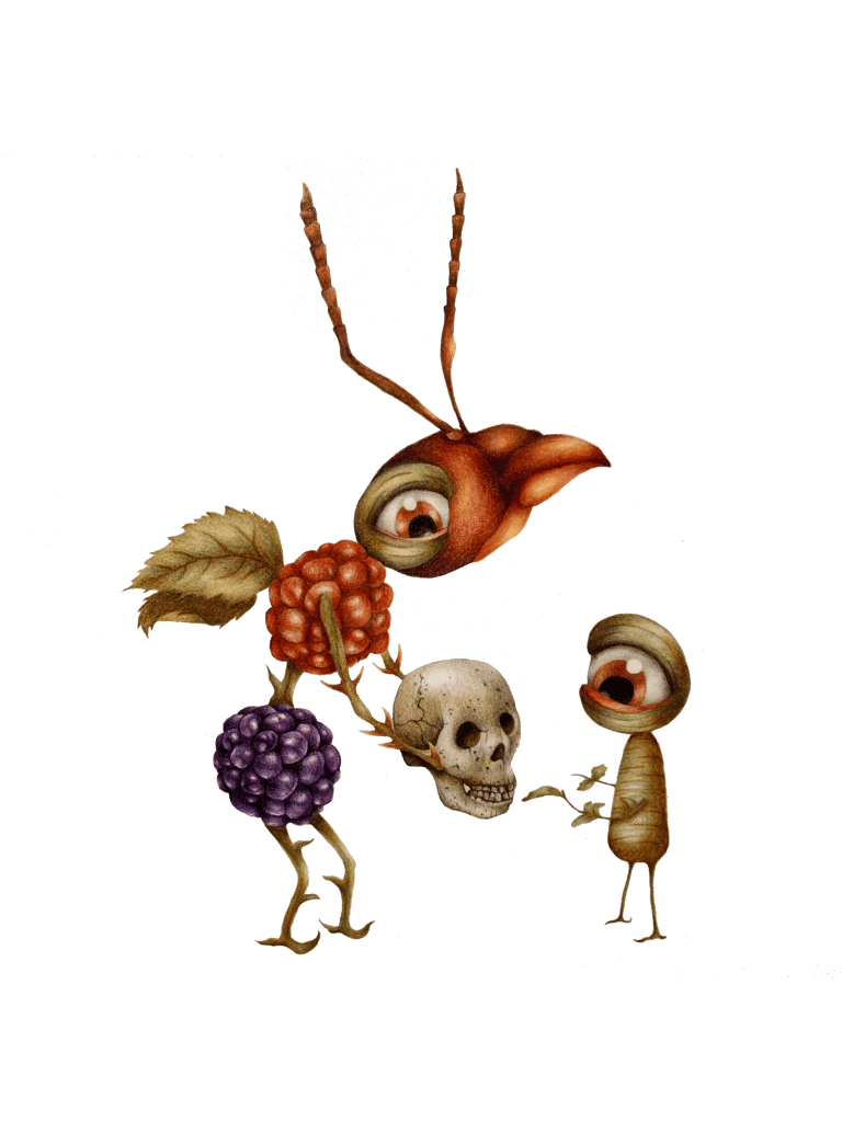E poi «scampagnate a contatto con la natura», tra «more, mirtilli, lamponi, noccioline, creare bastoni per le passeggiate con rami di nocciolo, […] mucche, pecore, capre, asini, lumache, rane, aquile», racconta l’artista. Momenti di un’infanzia spensierata e felice, che l’ha formata nel vedere il mondo con vividezza e incontrarlo con semplicità. Il Bestiario Ex Libris Moon, suo libro e progetto, nasce proprio nell’ottica di conservare e talvolta far affiorare nuovamente quei momenti contrassegnati dalla dimensione magica dell’incontro con la natura, anche come tributo a sua nonna e ai suoi incoraggiamenti. Il Bestiario immortala tutto questo «in piccole creature formate da vegetali e animali con i quali avrei voluto poter comunicare, essere una di loro e cercare di far capire alle persone come i miei occhi vedevano il mondo, trasmettendo la mia sensibilità nei confronti di tutte le meravigliose creature, grandi e piccine, che lo abitano», specifica Moon.