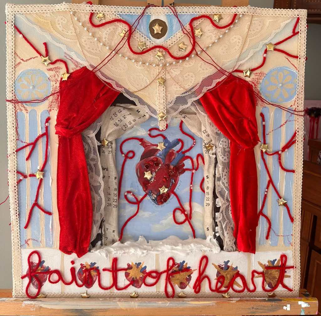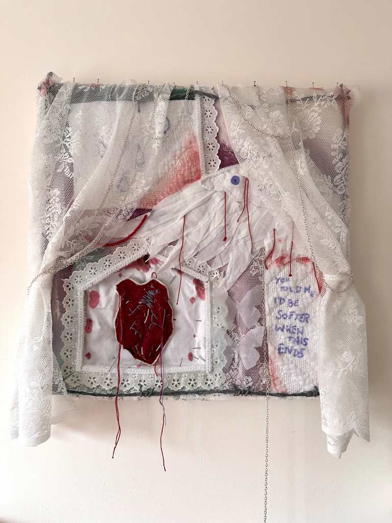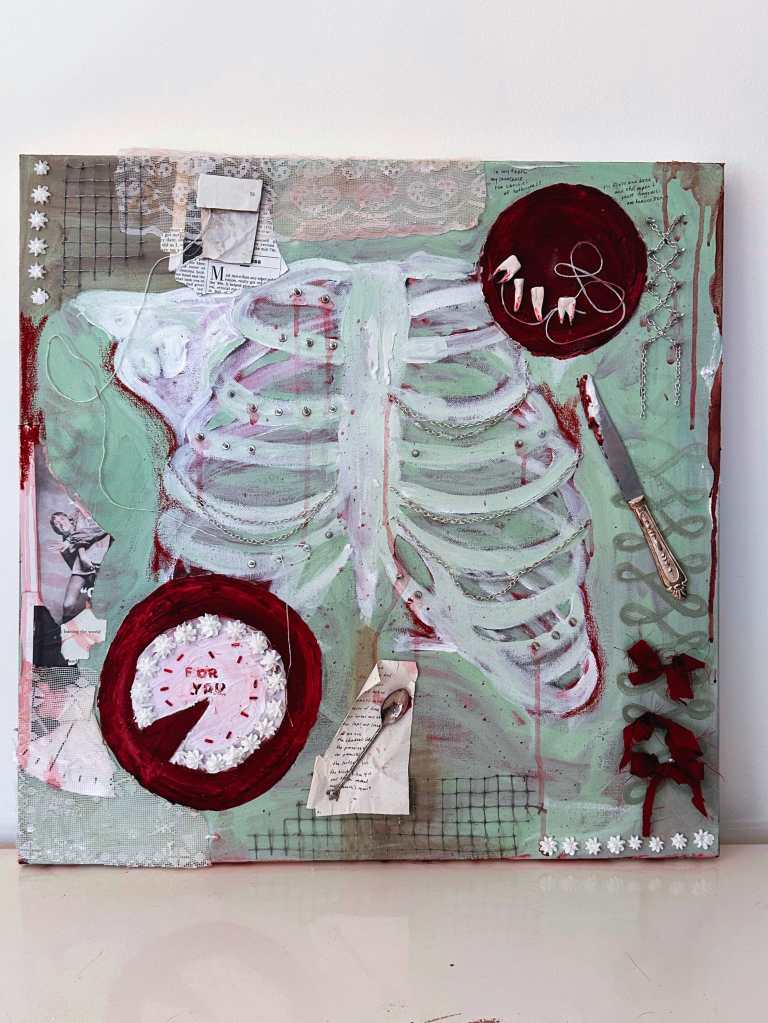 Dando uno sguardo più da vicino, una delle opere che più colpiscono si intitola “Faint of Heart” (Debole di Cuore), del 2024. Il pezzo è stato descritto da Sami come una sorta di “rivelazione”. Secondo lei, la vita non è per i “deboli di cuore” e abbiamo bisogno di coraggio per attraversare le nostre esperienze. “L’opera è ispirata al tema sempre presente nella mia vita secondo cui il coraggio mi è necessario per fare le cose che voglio fare”, aggiunge l’artista. Sami voleva che l’opera sembrasse cruda, vulnerabile, “come se fossimo messi a nudo” in quanto sostiene che le esperienze più importanti che l’essere umano possa vivere, siano rese possibili da questo tipo di vulnerabilità. L’opera presenta, oltre a questo lato più aggressivo, anche un effetto etereo e delicato, possibile grazie all’utilizzo di lini naturali, pizzo e l’utilizzo di colori più spenti (ad eccezione del rosso vivo, ovviamente!). “Ho usato anche dello stucco per le nuvole” – ci spiega Sami – utile per dare uno strato aggiuntivo a questi dettagli più chiari e sottili.
