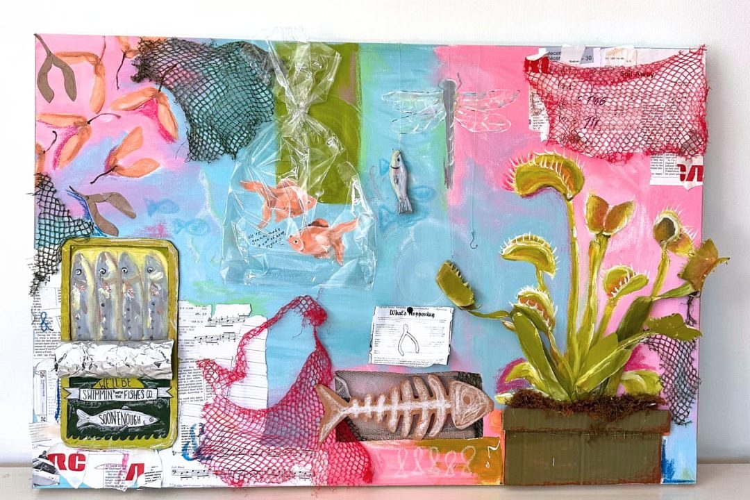 Anche “We’re gonna make it out of here, right?” è un’opera che merita attenzione: il quadro vuole dar voce alla sensazione claustrofobia, attraverso elementi come trappole o limitazioni. Il pesce nel sacchetto, la rete e la venere acchiappamosche ci riportano ad una sensazione di “smarrimento ingabbiato”, che ci porta ad essere fuori controllo. “Ho aggiunto anche la lattina di sardine e le lische di pesce per esprimere la disperazione che sorge quando immaginiamo la nostra fine”, spiega Sami.