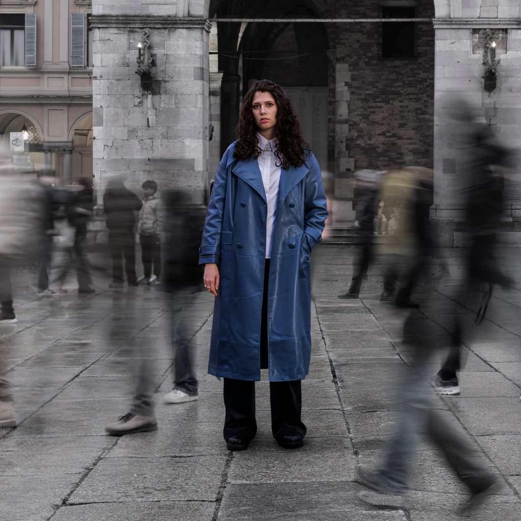 E se in silenzio fosse un’immagine? Sarebbe quella della sua copertina: una piazza – Piazza Cavalli, a Piacenza – con lei immobile al centro e il mondo che scorre intorno, sfocato. Un contrasto potente: immobilità e caos, presenza e assenza, voce e silenzio.